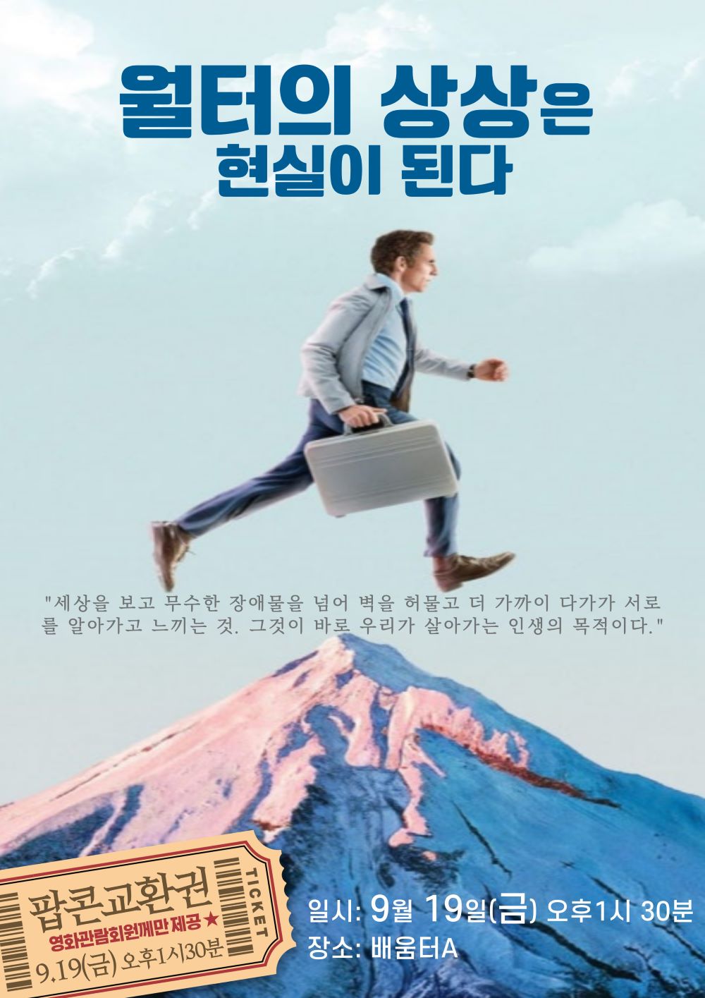 9월 이태영 큐레이터와 함께하는 시네마팝콘데이(월터의 상상은 현실이 된다, 2013) 페이지 정보 작성자 최고관리자 작성일2025-09-10 14:18 조회978회 댓글0건 최고관리자 관련링크 이전글 다음글 목록 본문 <9월 시네마팝콘데이>-작품: 월터의 상상은 현실이 된다(2013)-일시: 9월 19일(금) 오후1시 30분-장소: 배움터A-접수: 9월 11일(목) 오전 9시부터 현장접수-대상: 영화와 인생 이야기를 나누고 싶은 누구나(선착순 20명)-비용: 무료, 팝콘 제공"영화 전문 이태영 큐레이터와 함께 더 깊고 풍성하게 영화를 감상해 보세요.영화가 가진 숨은 이야기를 통해 서로의 감상을 나눌 수 있는 시간입니다."회원님의 많은 관심과 참여 바랍니다.감사합니다. 댓글목록 등록된 댓글이 없습니다. 이전글 다음글 목록