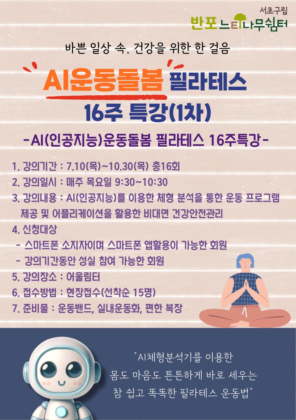 서초형 AI운동돌봄필라테스 16주 특강(1차) 신청 안내 페이지 정보 작성자 최고관리자 작성일2025-06-23 13:03 조회1,078회 댓글0건 최고관리자 관련링크 이전글 다음글 목록 본문 안녕하세요?신중년의 품격을 더하는 서초구립 반포느티나무쉼터입니다.AI운동돌봄 필라테스 16주특강(1차) 신청 안내입니다.-기간 : 7/10(목)~10/30(목) 매주 목요일 총16회-시간 : 오전 9시 30분 ~ 10시 30분 -장소 : 어울림터-내용 : 체형분석기를 통한 개인별 분석, 운동 제공 및 앱을 활용한 비대면 건강안전관리-준비물 : 운동밴드, 실내운동화, 편한 복장-접수 : 현장접수(선착순 15명)※스마트폰 소지자로 앱 활용 가능하며, 16주 성실참여 가능한 회원 우선! 회원님의 많은 관심과 참여 부탁드립니다.감사합니다.☎02-535-5090 댓글목록 등록된 댓글이 없습니다. 이전글 다음글 목록
