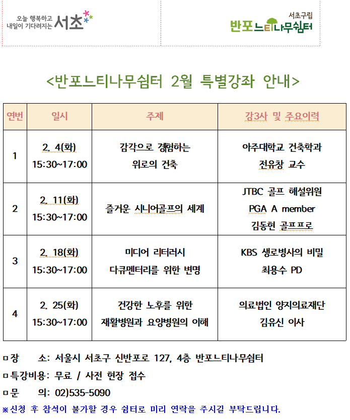 반포느티나무쉼터 2025년 1학기 수납 안내 및 2월 특별강좌 안내 페이지 정보 작성자 최고관리자 작성일2025-01-20 13:41 조회1,217회 댓글0건 최고관리자 관련링크 이전글 다음글 목록 본문 <2월 특별강좌 안내>반포느티나무쉼터 2025년 2월 특별강좌 안내입니다많은 관심과 참여 부탁드립니다감사합니다------------------------------------------------<1학기 수납 안내>회원님, 안녕하세요!반포느티나무쉼터 2025년 1학기 수납 안내입니다당첨이 되신 회원님은 수납기간내에 납부하셔야 최종 등록이 됩니다수납기간내 미수납시 무효처리되며 대기자에게 수강 권한이 이전됩니다<수납안내>1. 수납기간: 2025년 1월 13일(월) 10:00 ~ 1월 17일(금) 17:002. 수납방법1)카드결제: 쉼터 방문하여 결제2)계좌이체: 국민(반포느티나무쉼터) 081101-04-239745- 이체메모에 회원명과 강좌명 기입 필수- 할인혜택대상자(국가유공자증 제출한 회원)는 쉼터로 수강료 확인 후 이체*2025년 1학기 운영기간은 2025년 2월 3일(월) ~ 4월 25일(금)입니다!*쉼터 내부공부로 인해 1월 10일(금)까지 유선상담이 불가하오니 양해해주시길 부탁드립니다. 댓글목록 등록된 댓글이 없습니다. 이전글 다음글 목록