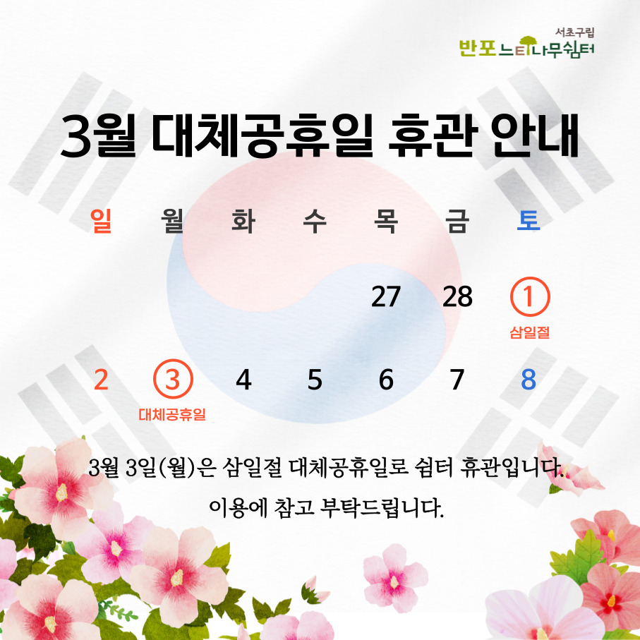반포느티나무쉼터 3월 대체공휴일 휴관 안내 페이지 정보 작성자 최고관리자 작성일2025-02-25 12:54 조회1,023회 댓글0건 최고관리자 관련링크 이전글 다음글 목록 본문 3월 3일(월)은 삼일절 대체공휴일로 쉼터 휴관입니다.쉼터 이용에 참고 부탁드립니다. 댓글목록 등록된 댓글이 없습니다. 이전글 다음글 목록