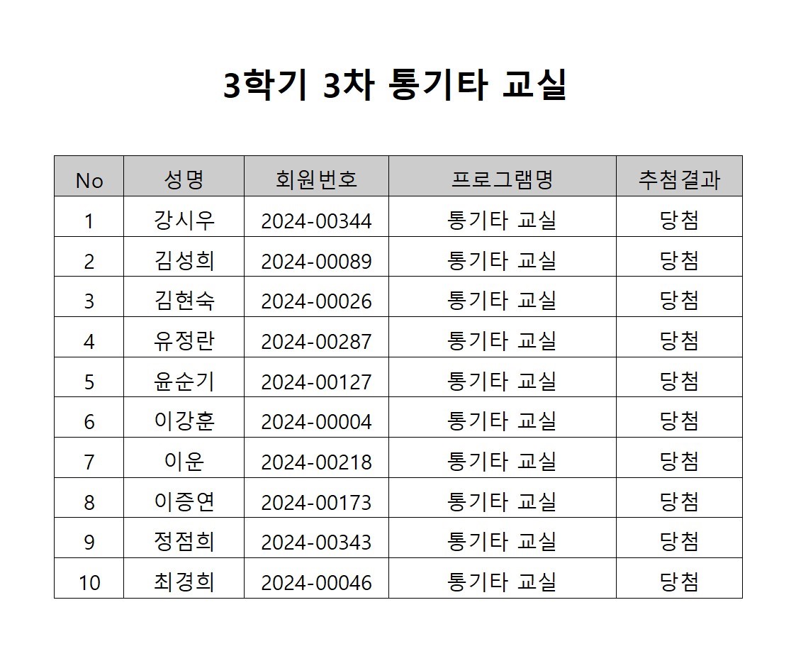 반포느티나무쉼터 2024년 3분기 추가강좌 '통기타교실' 추첨 결과 공지 페이지 정보 작성자 최고관리자 작성일2024-08-09 16:40 조회1,202회 댓글0건 최고관리자 관련링크 이전글 다음글 목록 본문 반포느티나무쉼터 2024년 3분기 추가강좌 '통기타교실' 추첨 결과입니다.당첨이 되신 회원님은 수납기간내에 수납을 완료하셔야 최종접수가 됩니다.미수납시 최종 무효처리되며 대기자에게 수강 권한이 이전됩니다.<수납안내>-수납기간: 8월 12일(월) 10:00 ~ 8월 16일(금) 17:00-수납장소: 반포느티나무 쉼터 로비-수납방법: 카드결제 및 계좌이체(계좌이체 전에 기관으로 전화바랍니다) 댓글목록 등록된 댓글이 없습니다. 이전글 다음글 목록