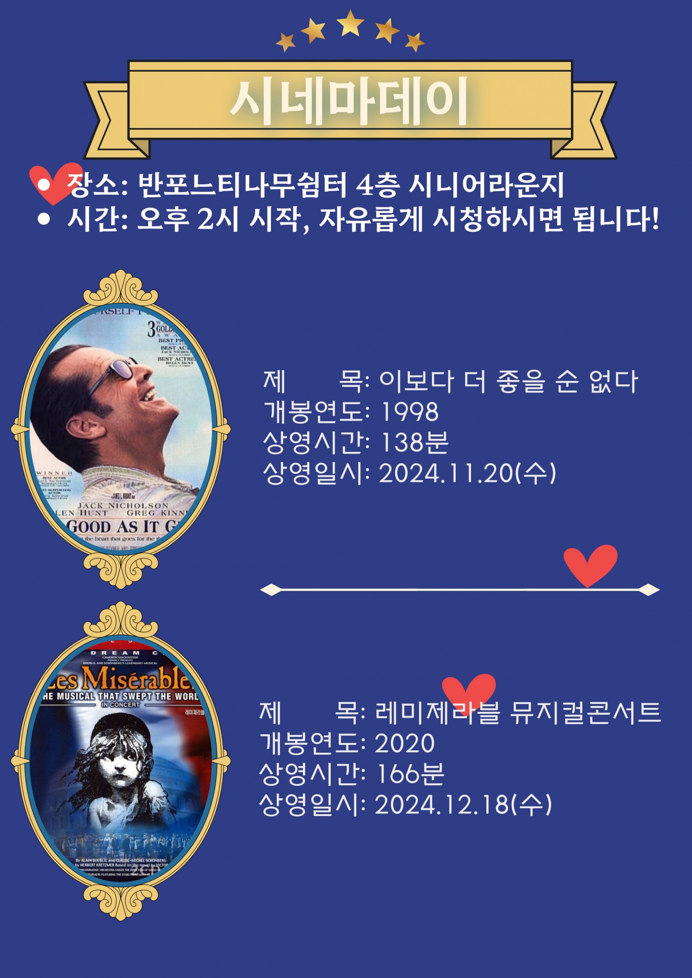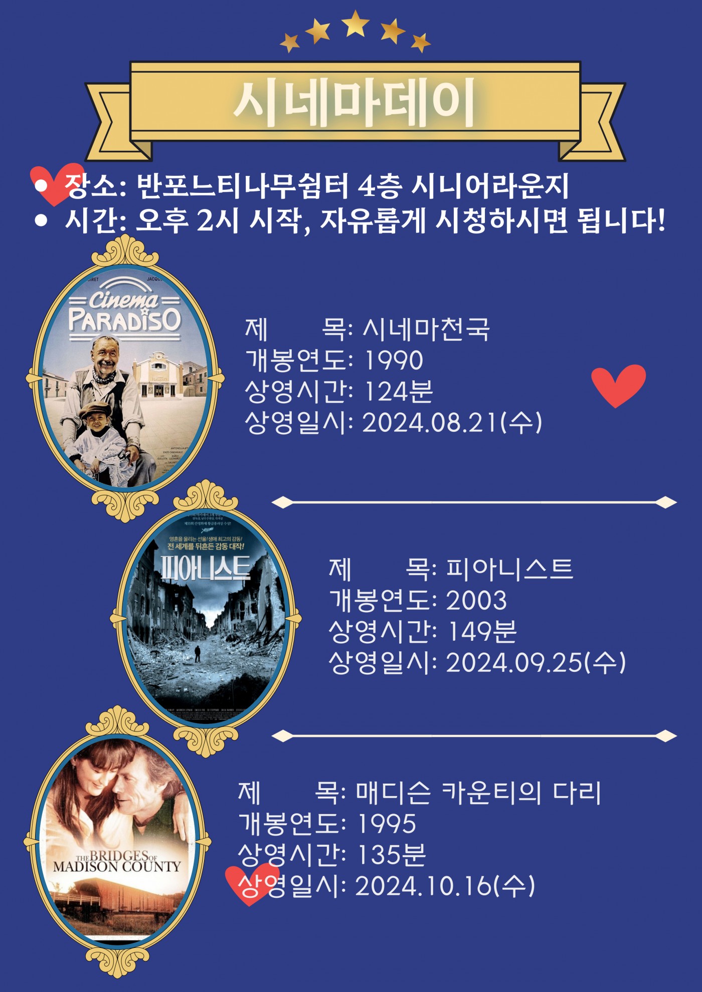 [시네마데이] 2024년 시니어라운지 시네마데이 운영 안내 페이지 정보 작성자 최고관리자 작성일2024-08-19 10:44 조회1,193회 댓글0건 최고관리자 관련링크 이전글 다음글 목록 본문 8월 21일(수) 시네마천국9월 25일(수) 피아니스트10월 16일(수) 매디슨 카운티의 다리11월 20일(수) 이보다 더 좋을 수 없다12월 18일(수) 레미제라블 뮤지컬콘서트오후 2시부터 상영합니다. 별도 신청없이 자유롭게 오셔서 시청하시면 됩니다! 댓글목록 등록된 댓글이 없습니다. 이전글 다음글 목록