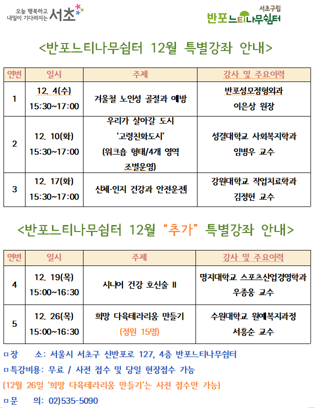 반포느티나무쉼터 12월 특별강좌 안내 페이지 정보 작성자 최고관리자 작성일2024-11-25 17:42 조회1,121회 댓글0건 최고관리자 관련링크 이전글 다음글 목록 본문 12월 특별강좌 안내입니다많은 관심과 참여 부탁드립니다감사합니다 댓글목록 등록된 댓글이 없습니다. 이전글 다음글 목록