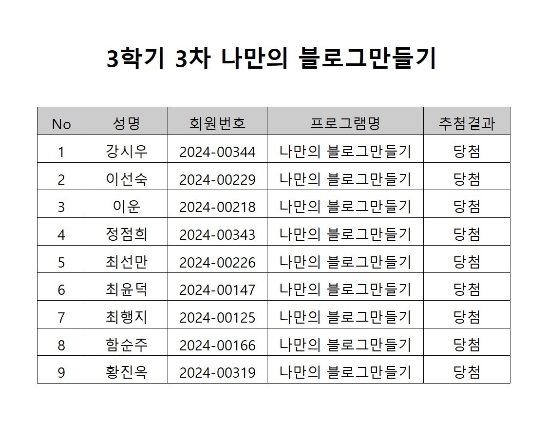 반포느티나무쉼터 2024년 3분기 추가강좌 '나만의 블로그만들기' 추첨 결과 공지 페이지 정보 작성자 최고관리자 작성일2024-08-09 16:38 조회1,293회 댓글0건 최고관리자 관련링크 이전글 다음글 목록 본문 반포느티나무쉼터 2024년 3분기 추가강좌 '나만의 블로그만들기' 추첨 결과입니다.당첨이 되신 회원님은 수납기간내에 수납을 완료하셔야 최종접수가 됩니다.미수납시 최종 무효처리되며 대기자에게 수강 권한이 이전됩니다.<수납안내>-수납기간: 8월 12일(월) 10:00 ~ 8월 16일(금) 17:00-수납장소: 반포느티나무 쉼터 로비-수납방법: 카드결제 및 계좌이체(계좌이체 전에 기관으로 전화바랍니다) 댓글목록 등록된 댓글이 없습니다. 이전글 다음글 목록