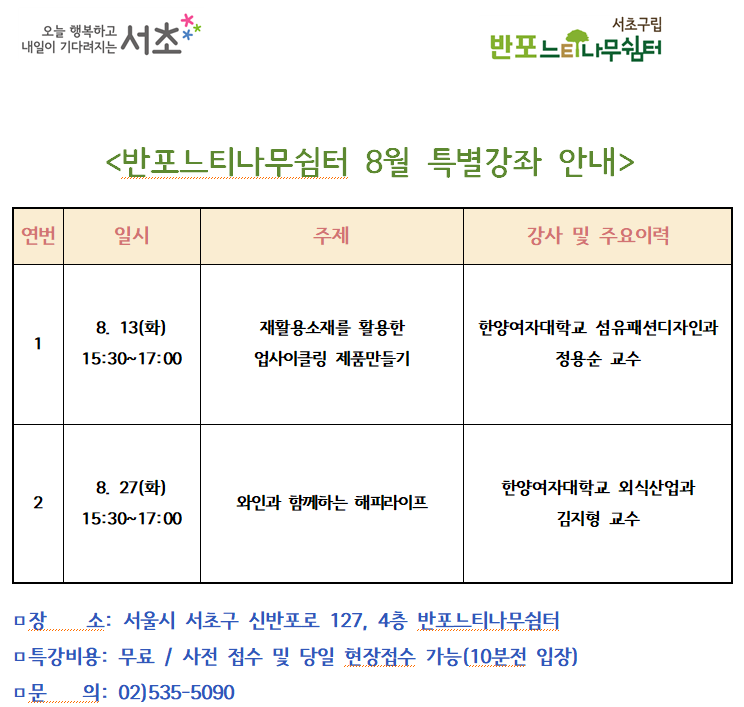 반포느티나무쉼터 8월 특별강좌 안내 페이지 정보 작성자 관리자 작성일2024-07-22 12:56 조회1,251회 댓글0건 관리자 관련링크 이전글 다음글 목록 본문 ※ 8월 특별강좌 중 '와인과 함께하는 해피라이프'가 위와 같이 8월 27일(화) 15:30~17:00로 변경되었으니 참고해주시기 바랍니다. 감사합니다. 댓글목록 등록된 댓글이 없습니다. 이전글 다음글 목록