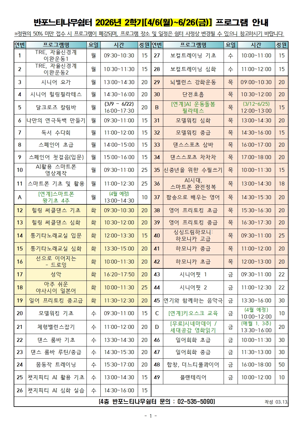 2026년 2학기[4/6(월) ~6/26(금)] 프로그램 및 접수 안내 페이지 정보 작성자 최고관리자 작성일2026-03-11 18:53 조회90회 댓글0건 최고관리자 관련링크 다음글 목록 본문 ★☆2026년 2학기[4/6(월) ~6/26(금)] 프로그램 시간표 안내☆★◎운영기간: 4/6(월) ~ 6/26(금) 총12주◎학기당 수강료 - 1시간 수업: 18,000원 - 1.5시간 수업: 27,000원 - 2시간 수업: 36,000원 - 2.5시간 수업: 45,000원 ▶(클릭) 2학기 프로그램 안내 바로가기<접수 및 추첨 안내>1. 접수기간: 3월16일(월) 9:00 ~ 3월20일(금) 18:002. 접수방법: 현장 및 온라인 접수 ▶(클릭) 온라인 접수 바로가기3. 추첨: 3월 23일(월) 오후4시, 홈페이지>커뮤니티>공지사항 게시<수납 안내>1. 수납기간: 3월 24일(화)~3월27일(금)2. 수납방법-카드결제: 쉼터 방문 결제-계좌이체: 쉼터로 문의 및 금액 확인 후 이체(국민은행 081101-04-239745 반포느티나무쉼터)*반포느티나무쉼터 회원만 접수 가능(회원이 아닌 경우 쉼터 내방하여 회원가입 후 진행)*당첨회원은 수납기간내에 수강료를 납부하여야 최종 등록, 미수납시 대기자에게 수강 권한 이전감사합니다.문의>02.535.5090 댓글목록 등록된 댓글이 없습니다. 다음글 목록