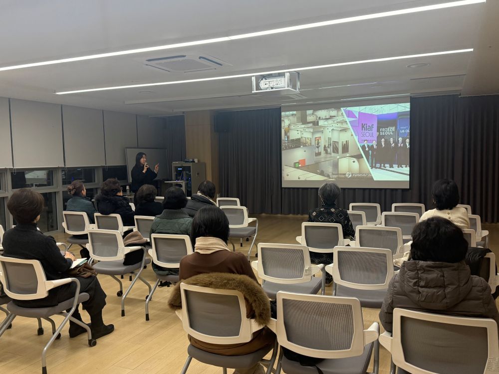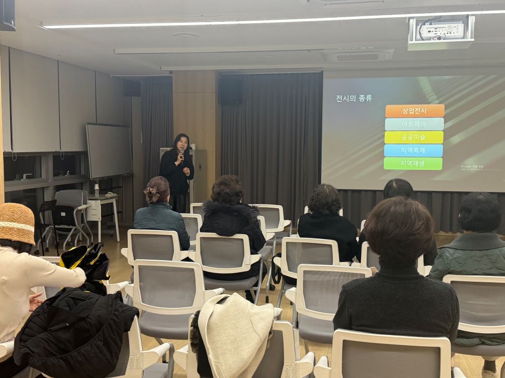 [특강]전시장에서 만난 세계: 작가들의 삶, 직업, 그리고 작은 에피소드 페이지 정보 작성자 최고관리자 작성일2025-12-17 16:37 조회93회 댓글0건 최고관리자 관련링크 이전글 다음글 목록 본문 ■ 일시: 2025. 12. 16.(화) 15:30 ~ 17:00 ■ 장소: 반포느티나무쉼터 어울림터 ■ 내용: 문화유목민 전혜연 대표와 함께 ‘전시장에서 만난 세계: 작가들의 삶, 직업, 그리고 작은 에피소드’라는 주제로 특강을 진행하였습니다. 이번 특강에서는 글로벌 전시 현장에서 마주한 다양한 문화적 차이와 세계 예술의 흐름을 소개하며, 그 속에서 국제 작가들과 교류하며 겪은 흥미로운 에피소드와 작업의 비하인드 이야기를 함께 나누었습니다. 작가들이 작품을 완성하기까지의 과정과 그들이 일상에서 유지하는 독특한 예술적 라이프스타일도 자연스럽게 풀어내며, 전시가 실제로 성립되기까지의 단계와 큐레이터의 역할을 쉽게 설명하여 흥미로운 시간이 되었습니다. 이번 특강에는 총 11명의 회원님이 참여하여 강의에 임해주셨습니다.앞으로도 많은 관심과 참여 부탁드립니다. 댓글목록 등록된 댓글이 없습니다. 이전글 다음글 목록