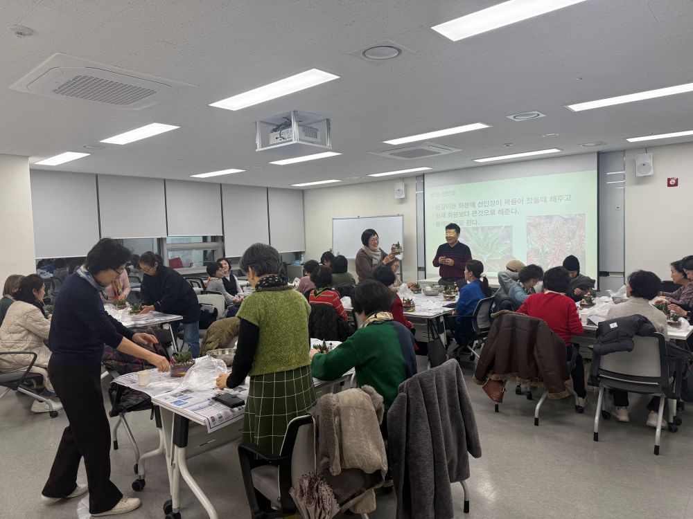 [특강]행복한 크리스마스 다육트리만들기 페이지 정보 작성자 최고관리자 작성일2025-12-24 17:08 조회107회 댓글0건 최고관리자 관련링크 이전글 다음글 목록 본문 ■ 일시: 2025. 12. 23.(화) 15:30 ~ 17:00 ■ 장소: 반포느티나무쉼터 배움터B ■ 내용: 수원대학교 미래융합교육원 화훼조형학 원예치료 서흥순 교수와 함께 ‘행복한 크리스마스 다육트리 만들기’라는 주제로 특강을 진행하였습니다. 이번 특강에서는 다육식물의 기본적인 이해를 돕기 위해 물주기, 빛, 온도 등 생육 특성과 관리 방법에 대해 알아보고, 유리 용기에 배양토, 마사토, 옥돌을 활용하여 다육식물을 배치하고 트리 등 다양한 미니 오너먼트를 장식하여 작품을 완성한 후, 직접 만든 작품 소개와 함께 소감을 나누는 시간을 가졌습니다. 공동 참여 활동을 통해 참여자 간 사회적 교류와 소속감을 강화하였고, 다육식물 돌봄 경험을 통해 일상속에서 긍정적인 생활 루틴을 형성하는 데 도움이 되었습니다. 이번 특강에는 총 26명의 회원님이 참여하여 강의에 임해주셨습니다. 앞으로도 많은 관심과 참여 부탁드립니다. 댓글목록 등록된 댓글이 없습니다. 이전글 다음글 목록