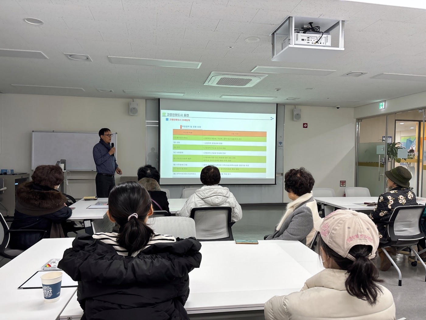 [특강]우리가 살아갈 도시 '고령친화도시' 페이지 정보 작성자 최고관리자 작성일2024-12-11 11:33 조회326회 댓글0건 최고관리자 관련링크 이전글 다음글 목록 본문 ■ 일시: 2024. 12. 10(화) 15:30 ~ 17:00■ 장소: 반포느티나무쉼터 배움터B■ 내용: 성결대학교 사회복지학과 임병우 교수와 함께 ‘우리가 살아갈 도시, 고령친화도시’라는 주제로 특강을 진행하였습니다. 이번 특강에서는 고령친화도시의 개념에 대해 알아보고, 사례를 통해 세계는 어떻게 고령친화도시를 계획하고 실행하고 있는지 살펴보았습니다. 또한 조별 워크샵 형식을 빌려 고령친화도시를 구축하기 위한 문제점 파악 및 개선 사항(정책)을 활발하게 제시하고 의견을 나누는 시간을 가질 수 있었습니다. 우리가 살고있는 서초구가 연령에 상관없이 누구나 살기 좋은 생활환경을 구축하고 시니어들이 능동적이고 건강한 사회참여가 될 수 있는 지역사회가 될 수 있도록 함께 고민해보는 좋은 기회가 되었습니다. 이번 특강에는 총 14명의 회원님이 참여하여 강의에 임해주셨습니다. 앞으로도 많은 관심과 참여 부탁드립니다. 댓글목록 등록된 댓글이 없습니다. 이전글 다음글 목록