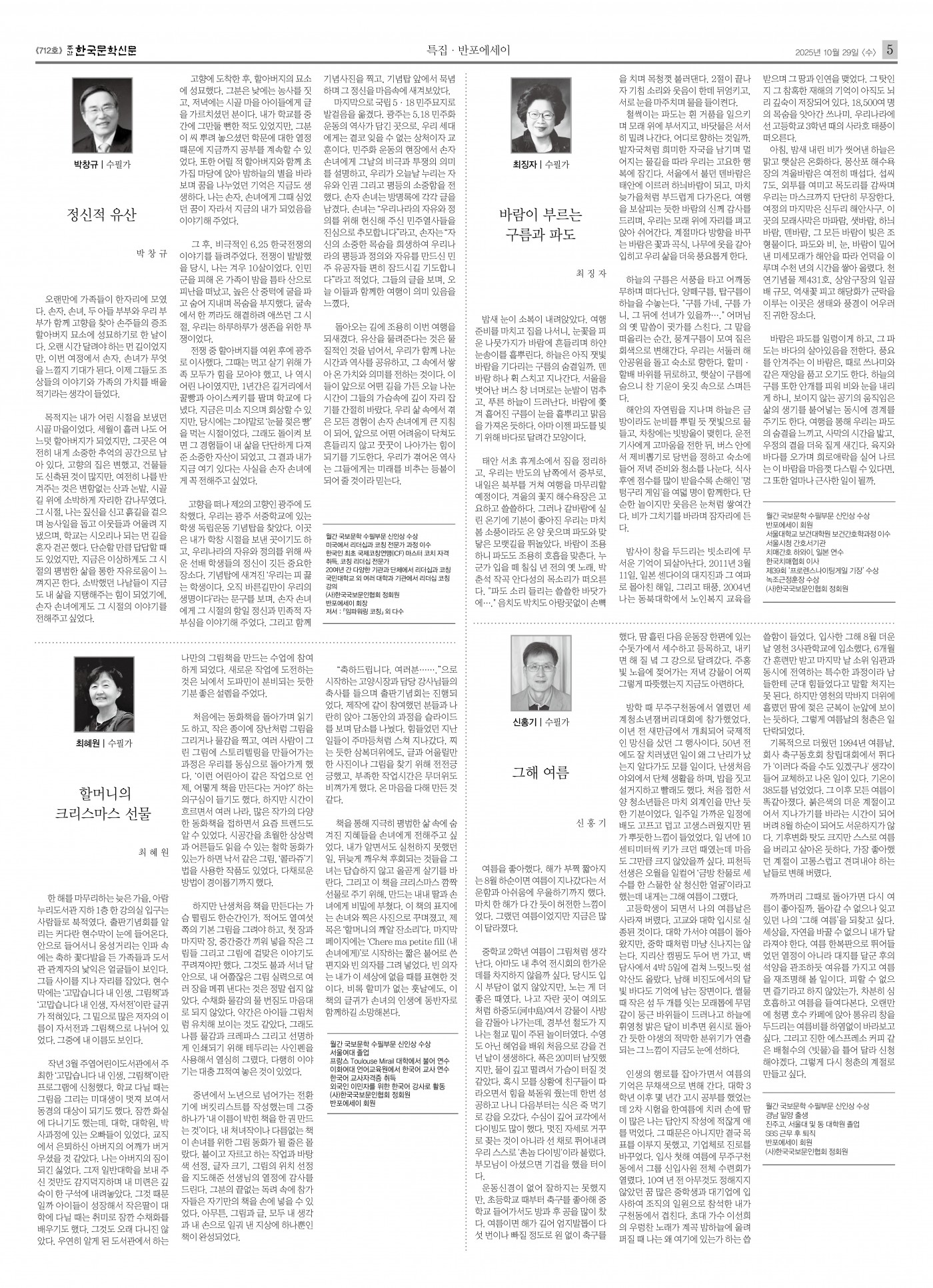 언론속의 쉼터: 주간한국문학신문 2025년 10월 29일(수) <712호> 특집·반포에세이_반포느티나무쉼터 수필반 … 페이지 정보 작성자 최고관리자 작성일2025-11-07 16:34 조회231회 댓글0건 최고관리자 관련링크 이전글 다음글 목록 본문 주간한국문학신문 2025년 10월 29일(수) <712호> 특집·반포에세이_반포느티나무쉼터 수필반 작품 실려주간한국문학신문 2025년 10월 29일(수) <712호> 특집·반포에세이에 반포느티나무쉼터 수필반에서 수필가로 등단한 4분 회원님의 작품이 실렸습니다.앞으로도 수필반에 많은 관심과 성원 부탁드립니다.감사합니다. 댓글목록 등록된 댓글이 없습니다. 이전글 다음글 목록