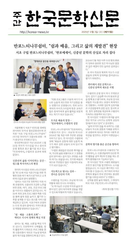 반포느티나무쉼터, 반포에세이 동인지 창간호 <느티나무 그늘 아래> 출판 페이지 정보 작성자 최고관리자 작성일2026-02-06 14:11 조회40회 댓글0건 최고관리자 관련링크 이전글 다음글 목록 본문 반포느티나무쉼터 수필반에서 활동중인 수강회원님의 작품들을 하나로 꾸려 반포에세이 동인지 창간호 <느티나무 그늘 아래>가 발간되었습니다. 뜨거운 배움의 열정으로 탄생한 작품집 <느티나무 그늘 아래> 출판을 진심으로 축하드립니다. o 관련기사: 반포느티나무쉼터, "쉼과 배움, 그리고 삶의 재발견" 현장(주간한국문학신문), 2025.1203 댓글목록 등록된 댓글이 없습니다. 이전글 다음글 목록
